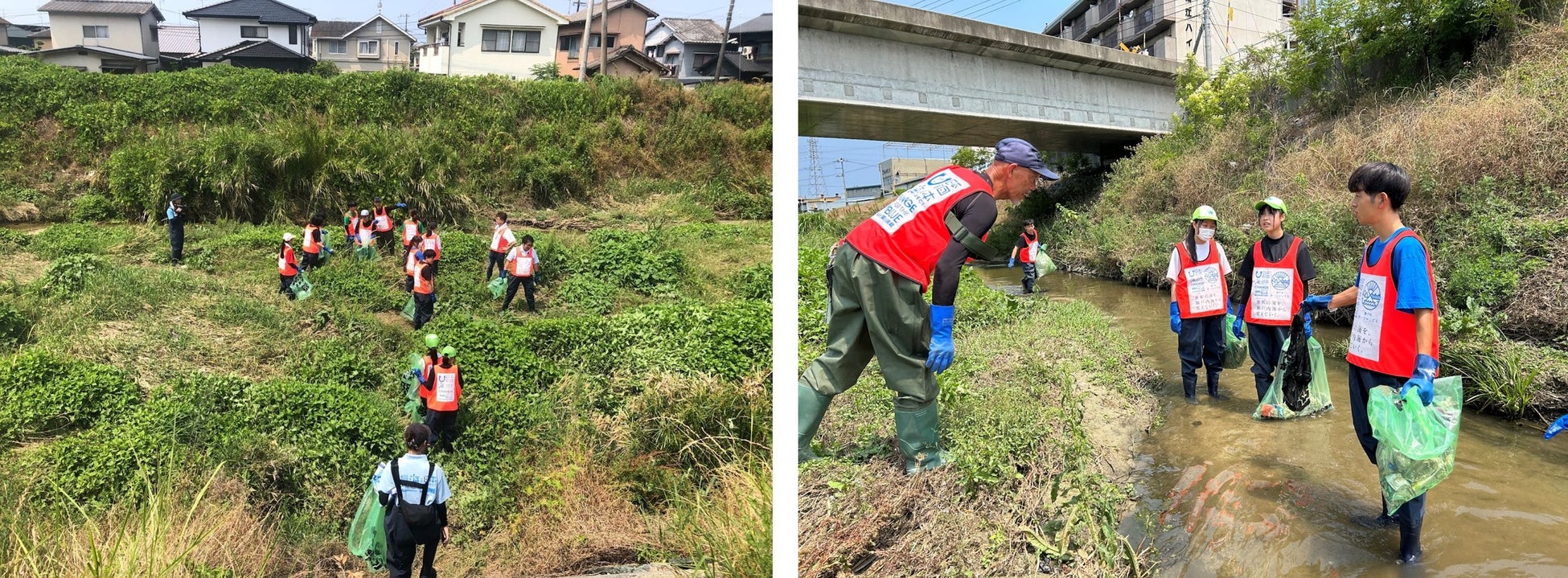 学校内の環境活動グループである「新世界学辞典」のメンバーと連携した大川における清掃