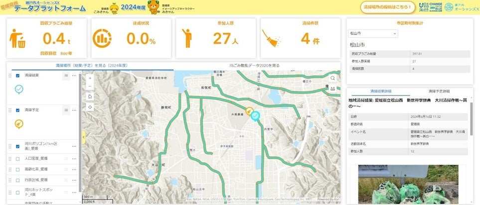また、今回の清掃活動の計画と結果は瀬戸内オーシャンズX推進協議会のウエブサイト内の「瀬戸内オーシャンズXデータプラットフォーム」で愛媛県向けに特設した入力フォームを活用しました。これを活用することで、瀬戸内オーシャンズXの4県におけるごみの回収目標(年間86トン)まで残りどれくらいかが表示されます。瀬戸内海全体を見渡し、回収が行き届いていない場所や回収すべき時期が浮き彫りになり、効率的な清掃活動を展開していく上で役立つ情報が蓄積されていきます。清掃活動に取り組む学生や団体が県を越えて繋がり、共通目標に向けた顔の見える活動となって広がっていくことが期待されます。