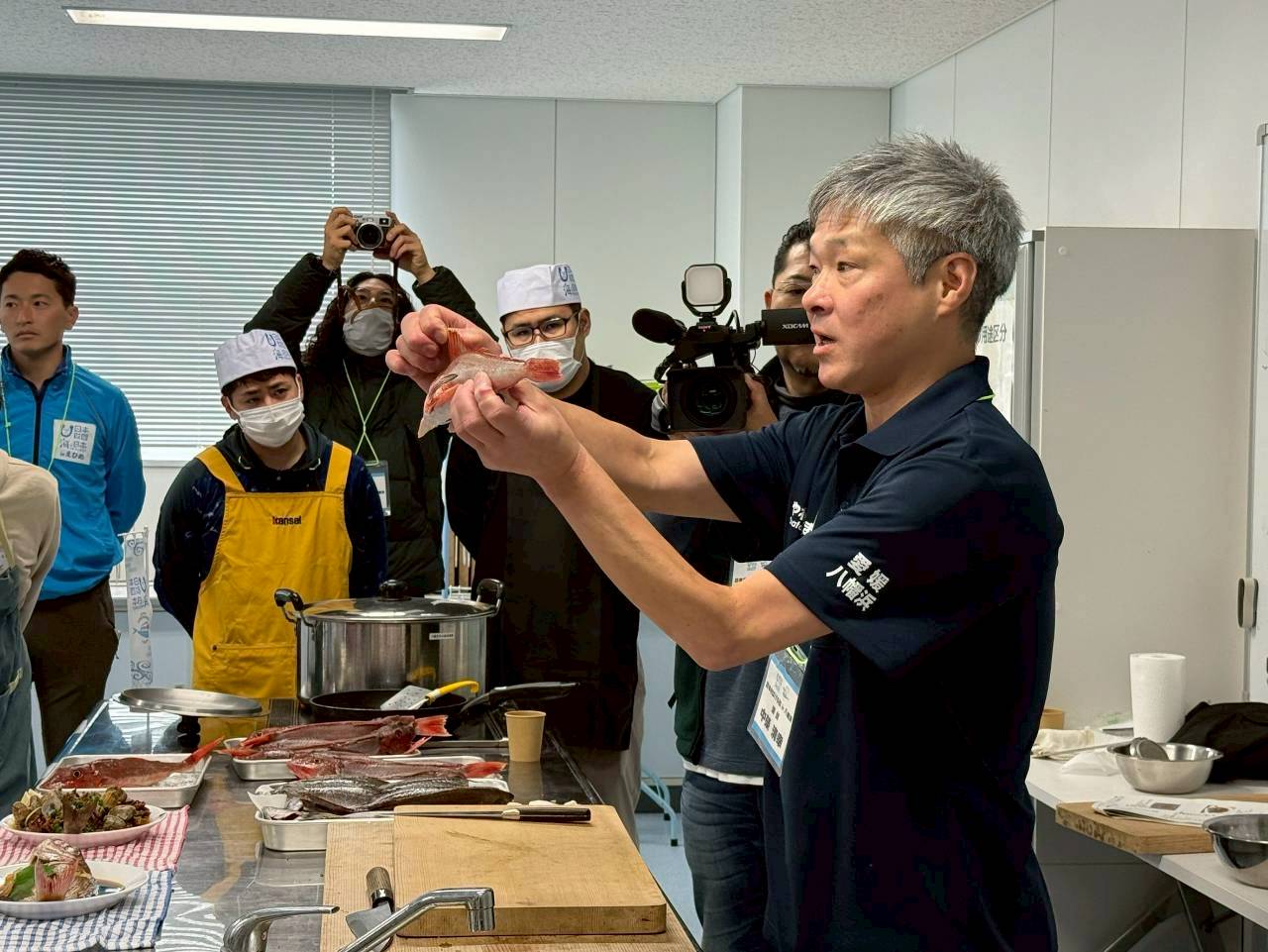 海の厄介者である「アイゴ」について、講師の株式会社古屋野水産の古屋野太一さんからお話を聞きました。アイゴは、ヒレに毒があり、皮や内臓から独特の臭いが出ることから、市場に流通することの少ない魚です。古屋野さんからは、漁獲方法や一定期間の生かし、締め方、さばき方を徹底して管理することで、臭みを出さずに調理できることを学びました。座学の後は、古屋野さんによるアイゴのさばき方、中榮さんによる魚のさばき方のデモンストレーションを見学しました。手際よくさばかれていく様子を間近で見て、魚の扱いの難しさや高い技術を感じるとともに、魚を大切に扱うことの意味を考える時間となりました。