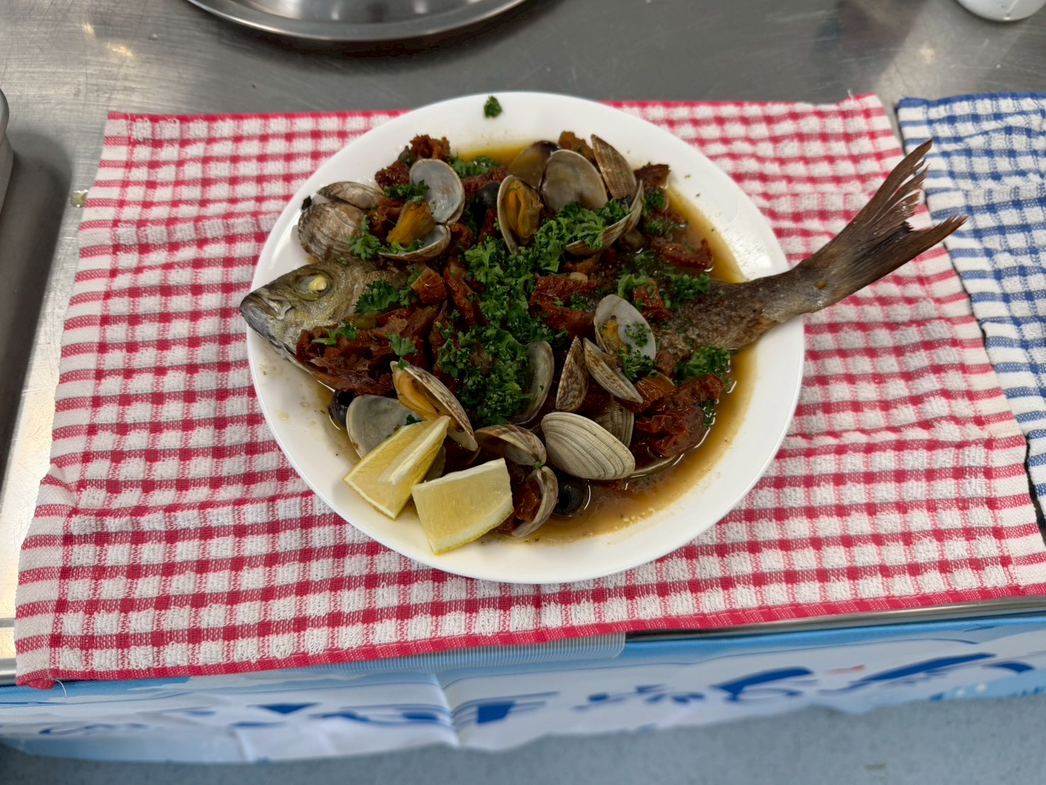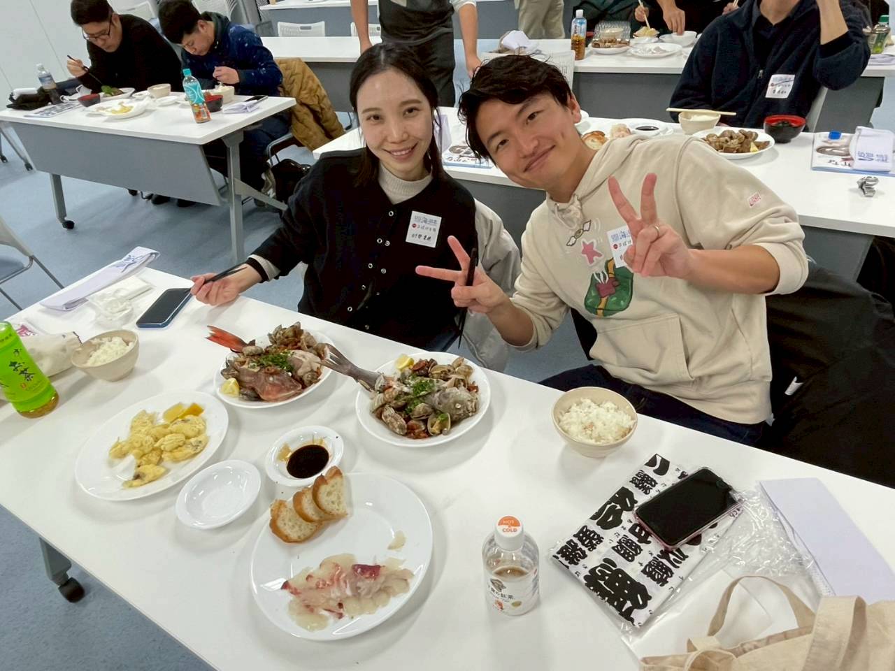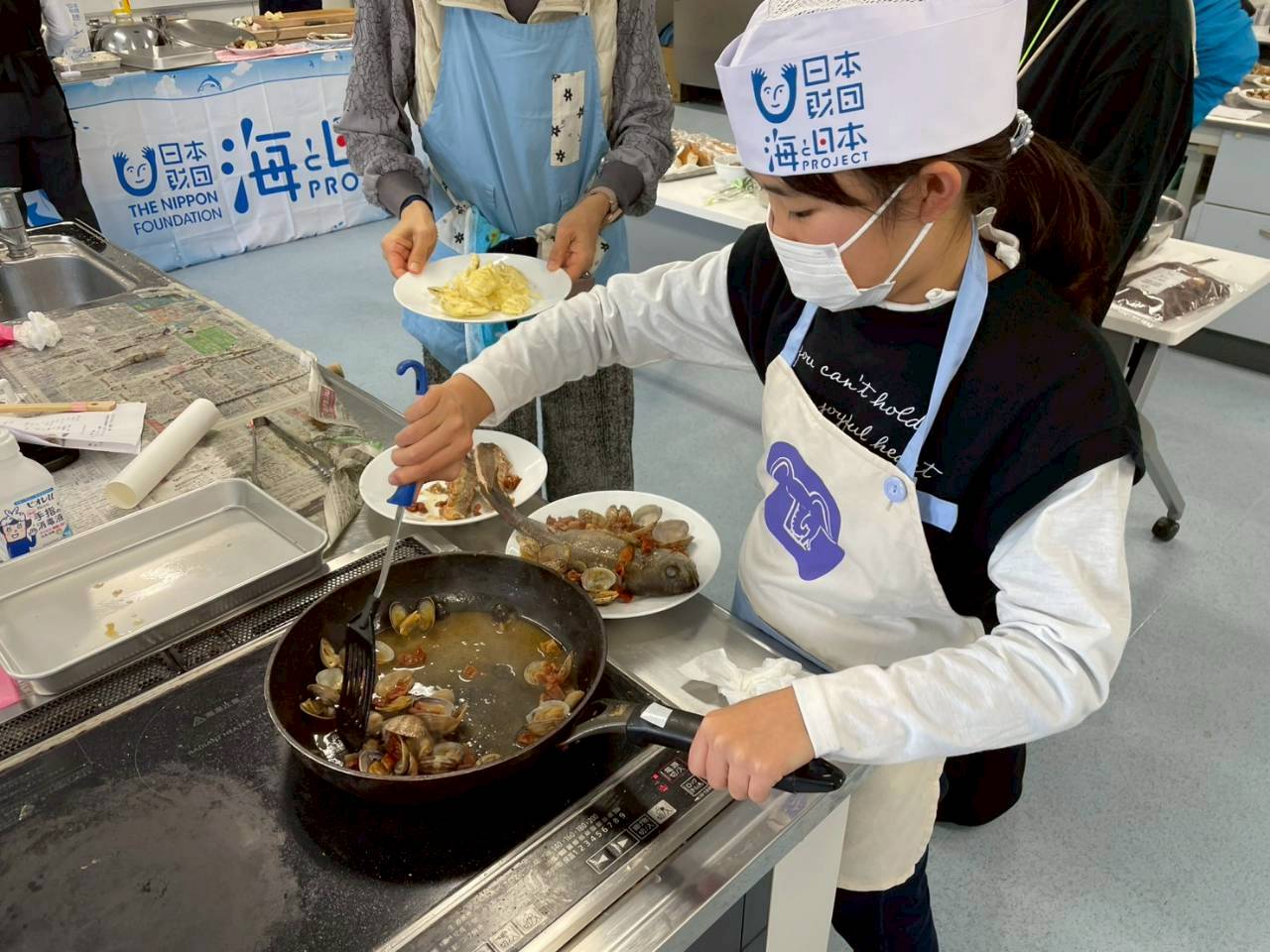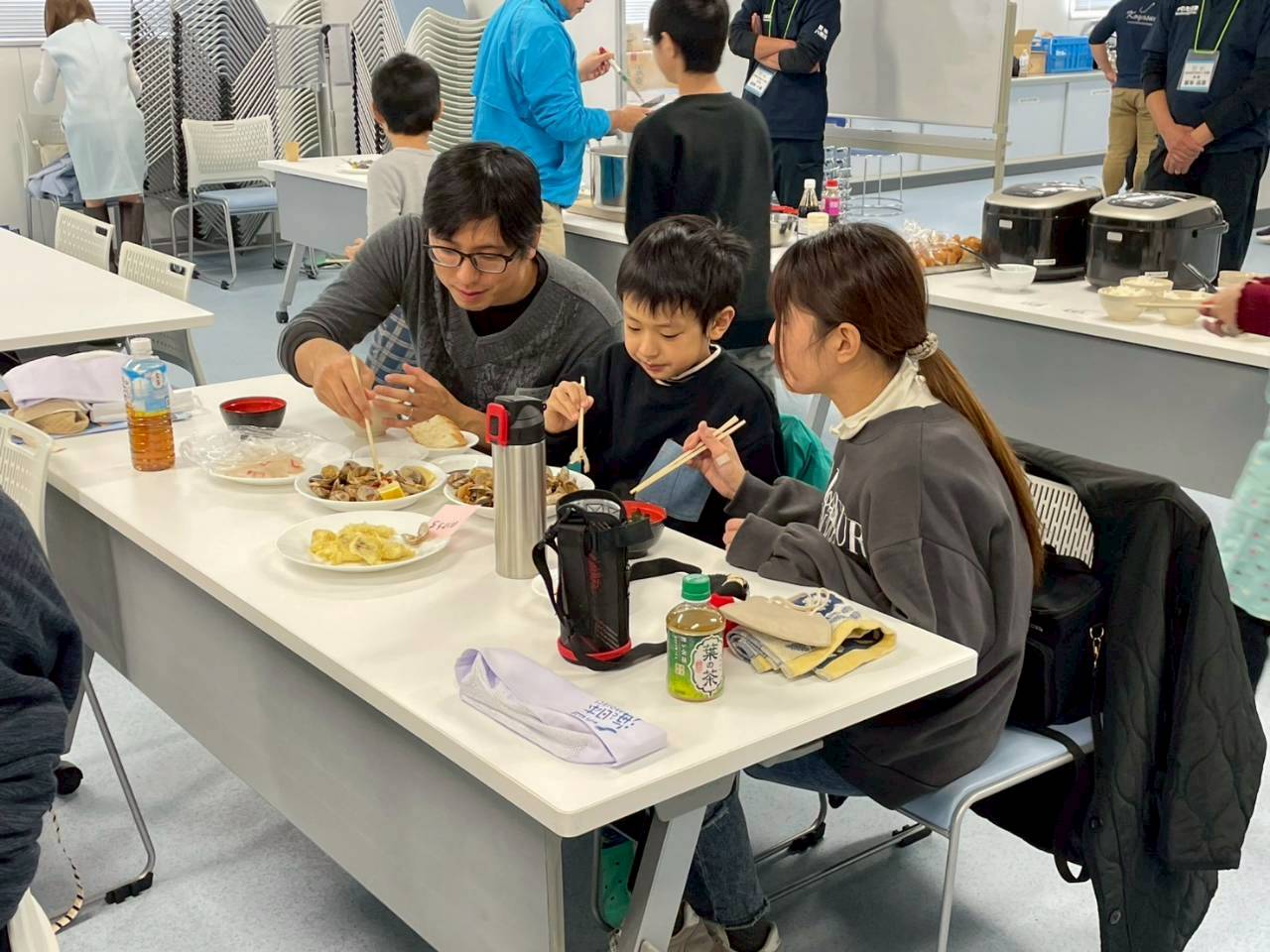 下処理を終えた後は、さばいた魚を使って調理を行いました。アイゴは、新鮮なものならではの引き締まった身を活かし、お刺身と天ぷらに仕上げ、特に、中榮さんおすすめの生姜醤油で味わうアイゴは、素材のうま味を感じられる一品でした。また、参加者が自分で選んだ魚については、煮付けまたはアクアパッツァのいずれかを選んで調理。煮付けは、魚がやわらかくなるまで丁寧に火を入れ、生姜の香りが全体に行き渡る仕上がりとなりました。アクアパッツァは、ニンニクとオリーブオイルの香りにドライトマトの風味が加わり、魚のおいしさを引き立てる料理です。調理後は、完成した料理を味わい、自分でさばき、調理した魚のおいしさを実感する時間となりました。慣れない作業に苦戦しながらも、参加者同士で声を掛け合い、終始和やかな雰囲気の中で調理が進みました。完成した料理を味わう場面では、「料理の幅が広がった」「美味しい魚を調理できて楽しかった」といった声も聞かれ、自ら選び、調理した魚のおいしさを実感する時間となりました。