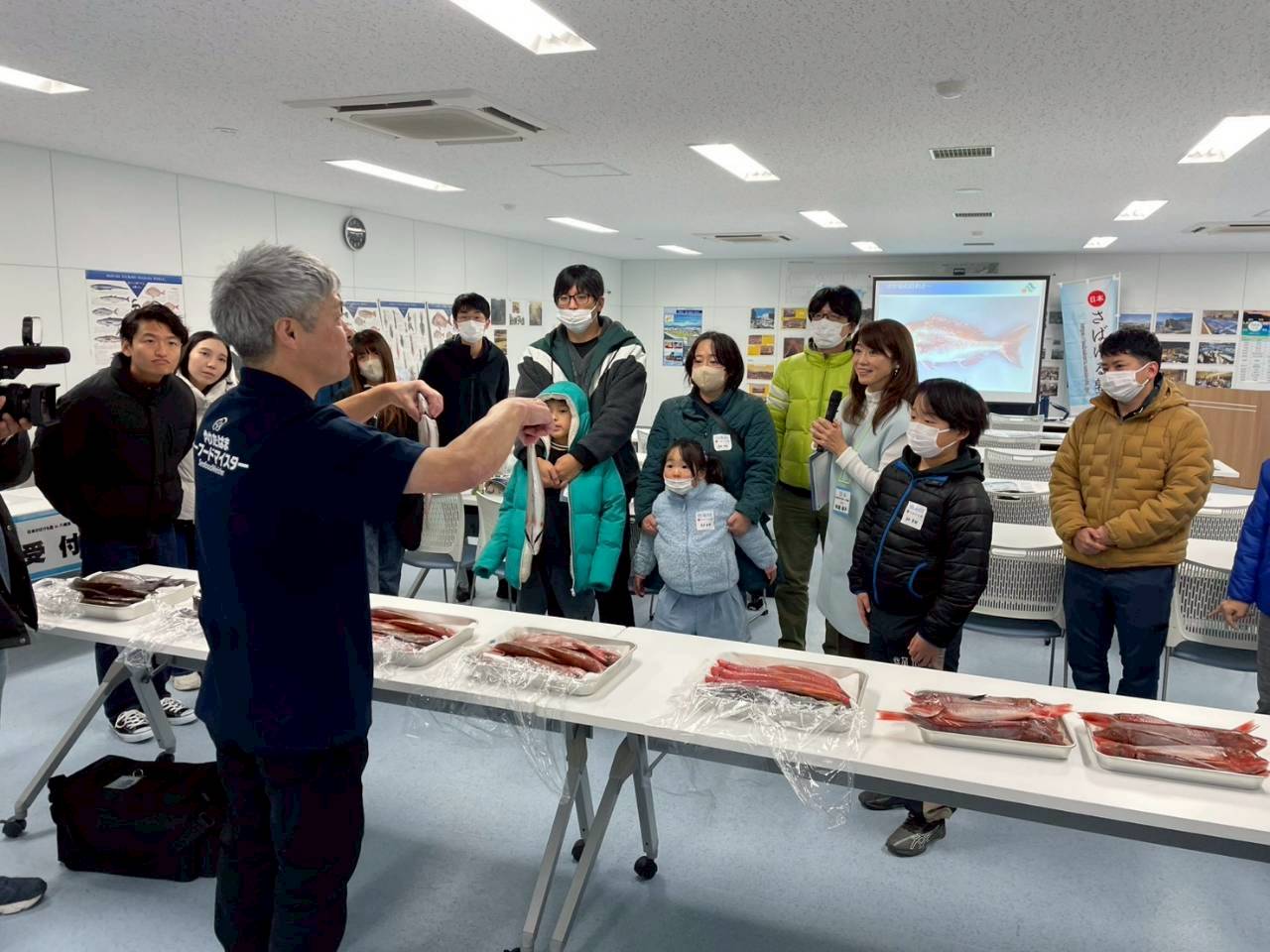 はじめに、八幡浜市水産港湾課の山内武弥さんから、八幡浜市の水産業の特徴や魚の流通の仕組みについて説明をしていただきました。魚が水揚げされてから食卓に届くまでの流れを知り、参加者は普段何気なく口にしている魚は、多くの人の仕事が関わっていることを実感しました。また、「どーや市場」が地域の水産業を支える重要な役割を担っていることを学び、身近な市場の存在を改めて意識するきっかけとなっています。続いて、講師である八幡浜市シーフードマイスターの中榮清幸さんから、市場での魚の買い方についてお話を伺いました。お店の人と積極的に会話をすることや、迷ったときは直感を信じて選ぶことの大切さを知り、魚選びへの意識が変わりました。