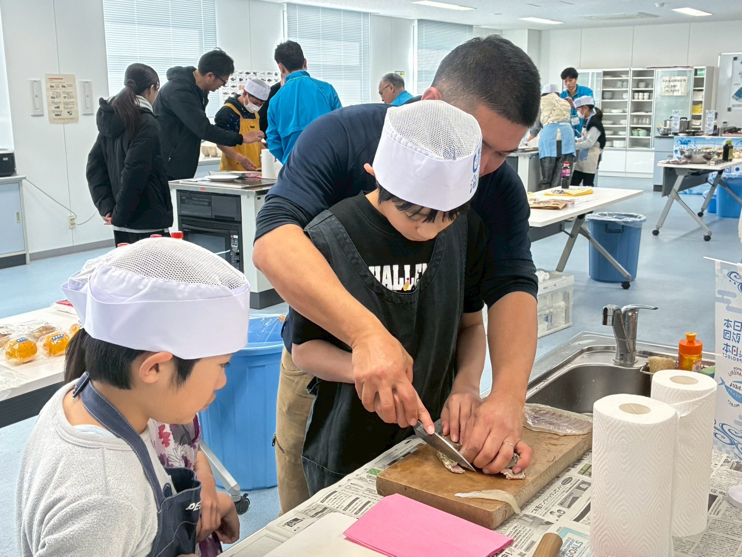 中榮さんが持参した魚とアイゴを使い、講師の指導のもと実際に魚をさばきました。アイゴはヒレに毒があるため、はじめにハサミでヒレを取り除き、続いて専用のハサミを使って浮き袋を処理するなど、普段は経験できない工程を行いました。参加者は毒に注意しながら一つひとつの作業に真剣に取り組みました。