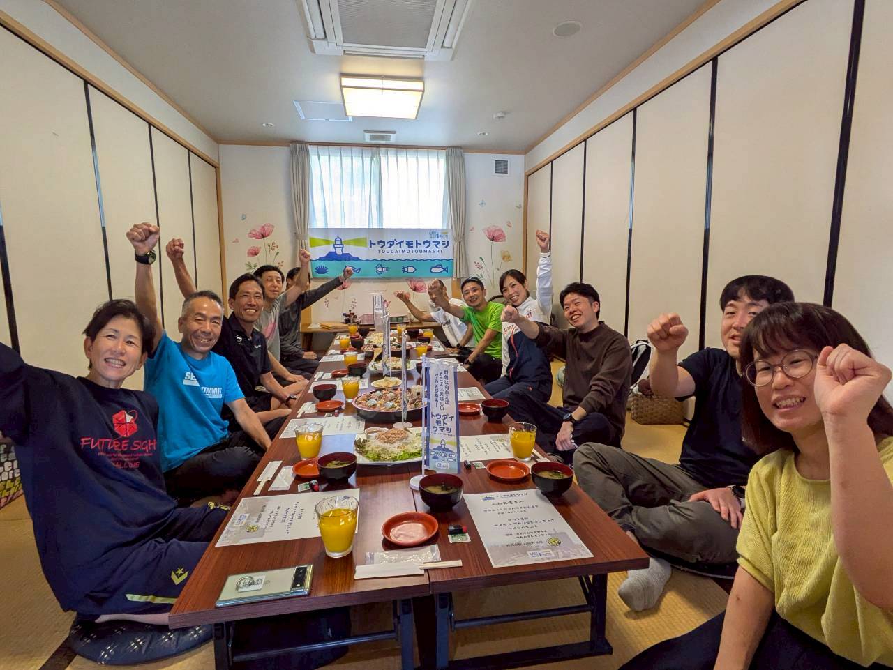 ゴール後のお楽しみは、大崎鼻灯台周辺や周辺の宇和海で漁獲された水産資源をふんだんに使った特製の「灯台バラチラシ寿司」!大崎鼻灯台を模した四角の灯台は酢飯で制作し、バラチラシの具材を周辺の海に見立てました。一本釣りのタチウオやイサキを始め、マダイやケンサキイカ、ウニやマダコなど、地元の海の豊かを象徴する水産資源をふんだんに使ったご馳走で、参加者は「トウダイモトウマシ」なメニューに舌鼓を打ちました。