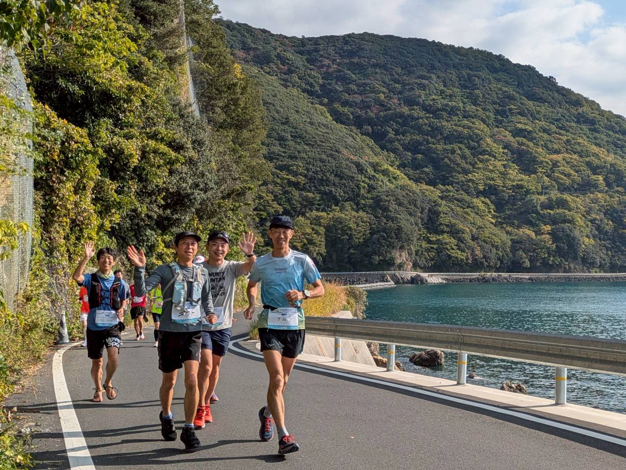 この日参加したのは、県内各地から集まった11名のランナー。地元の観光交流拠点施設「あけはまーれ」を出発し、12.5キロ先の大崎鼻灯台を周回して帰ってくる往復25キロのコースを走りました。