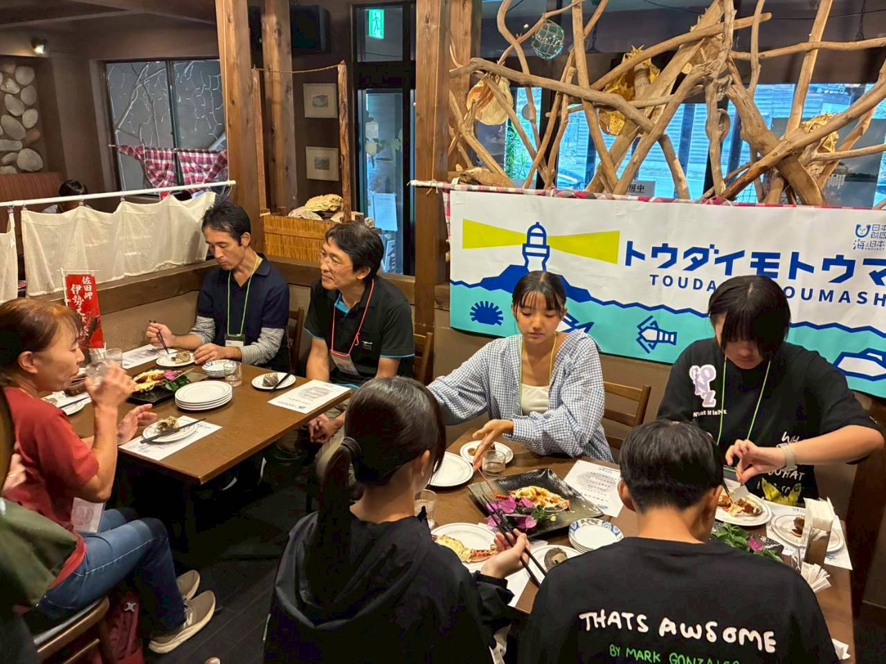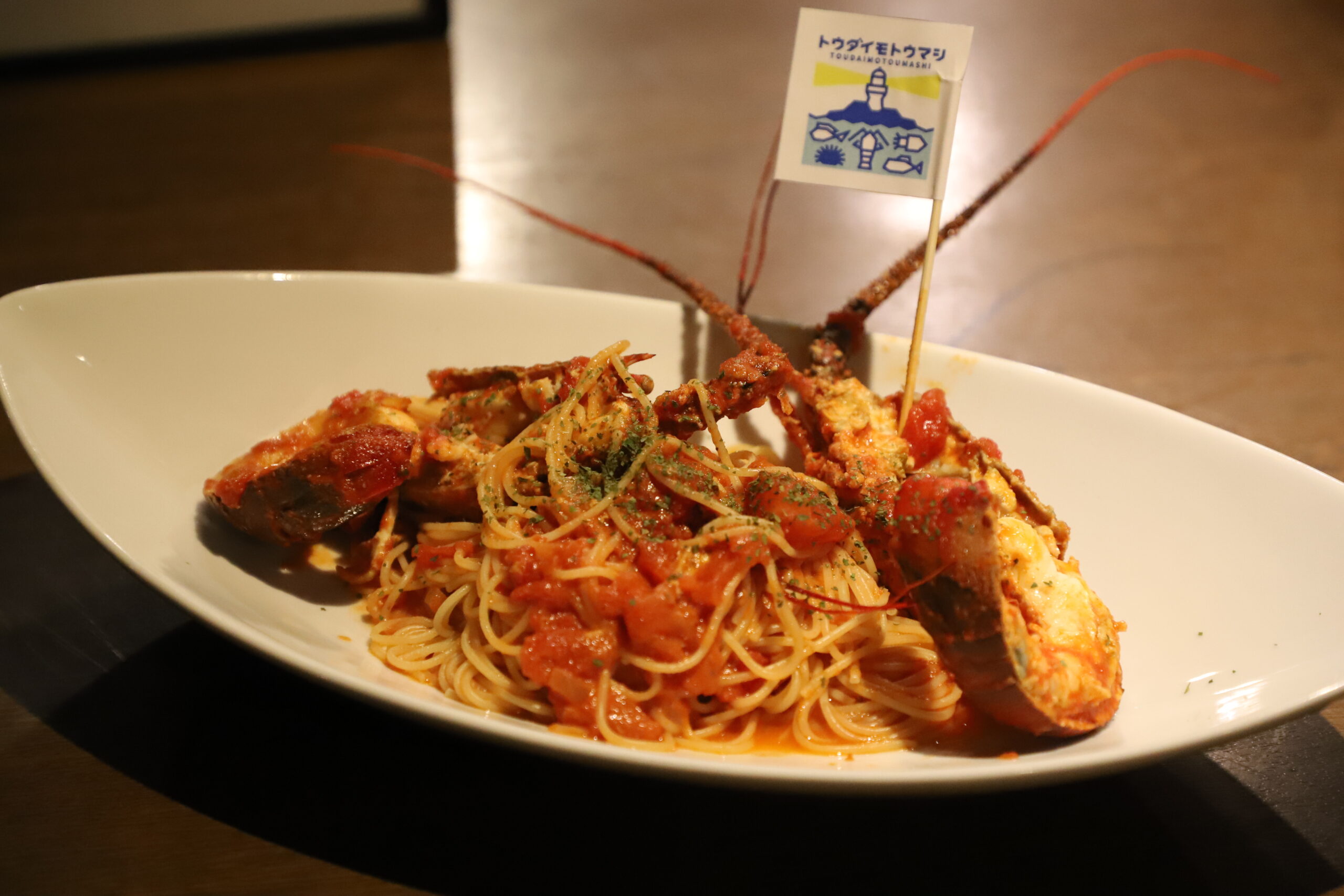 ツアーの最後は、お楽しみの食事会。佐田岬灯台周辺で獲れたイセエビ、アカウニ、サザエを使った超豪華な特別メニューを実食!この日準備したのは、「赤ウニ1スプーン」、「伊勢海老のパスタ」、「サザエの香草パン粉焼き」など、この日限りの特別メニュー。参加者は、先ほど見学した佐田岬灯台とその周辺の漁場の様子を思い出しながら、灯台×水産資源から生まれた「トウダイモトウマシ」な瞬間を堪能しました。