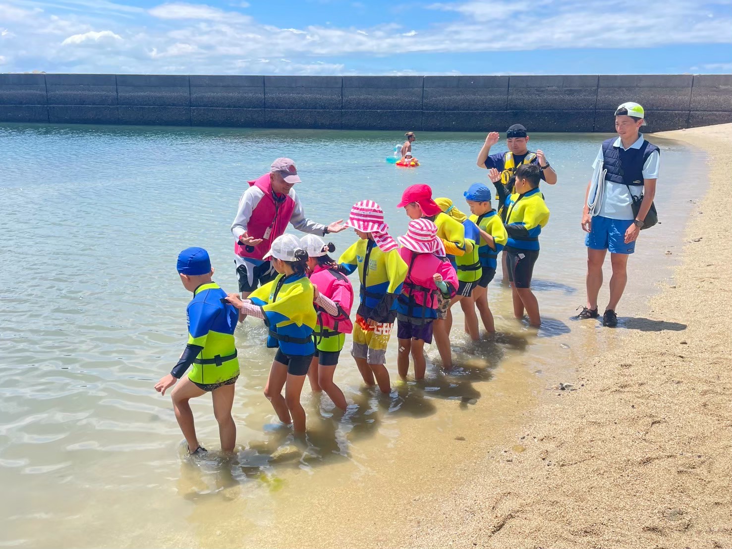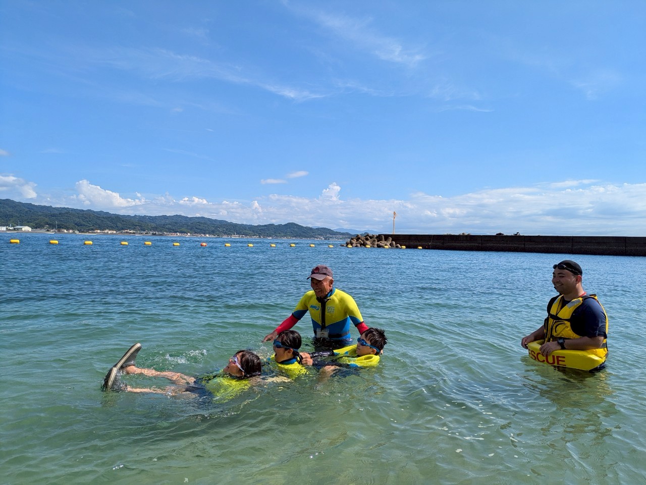水辺の危険とフローティングアイテムの重要性を知ってもらった上で、会場内の鹿島海水浴場に移動し、実際にフローティングアイテムを着用して泳いでみます。参加者された方の中には初めてフローティングライフジャケットを着用して泳ぐ子もおり、最初は不安げな表情を浮かべていましたが、イカ泳ぎを身に付けることで長く浮けるようになりました。イベント中は参加者の安全確保のため松山海上保安部にも協力いただき、小型艇による警戒や見守りを行っていただきました。