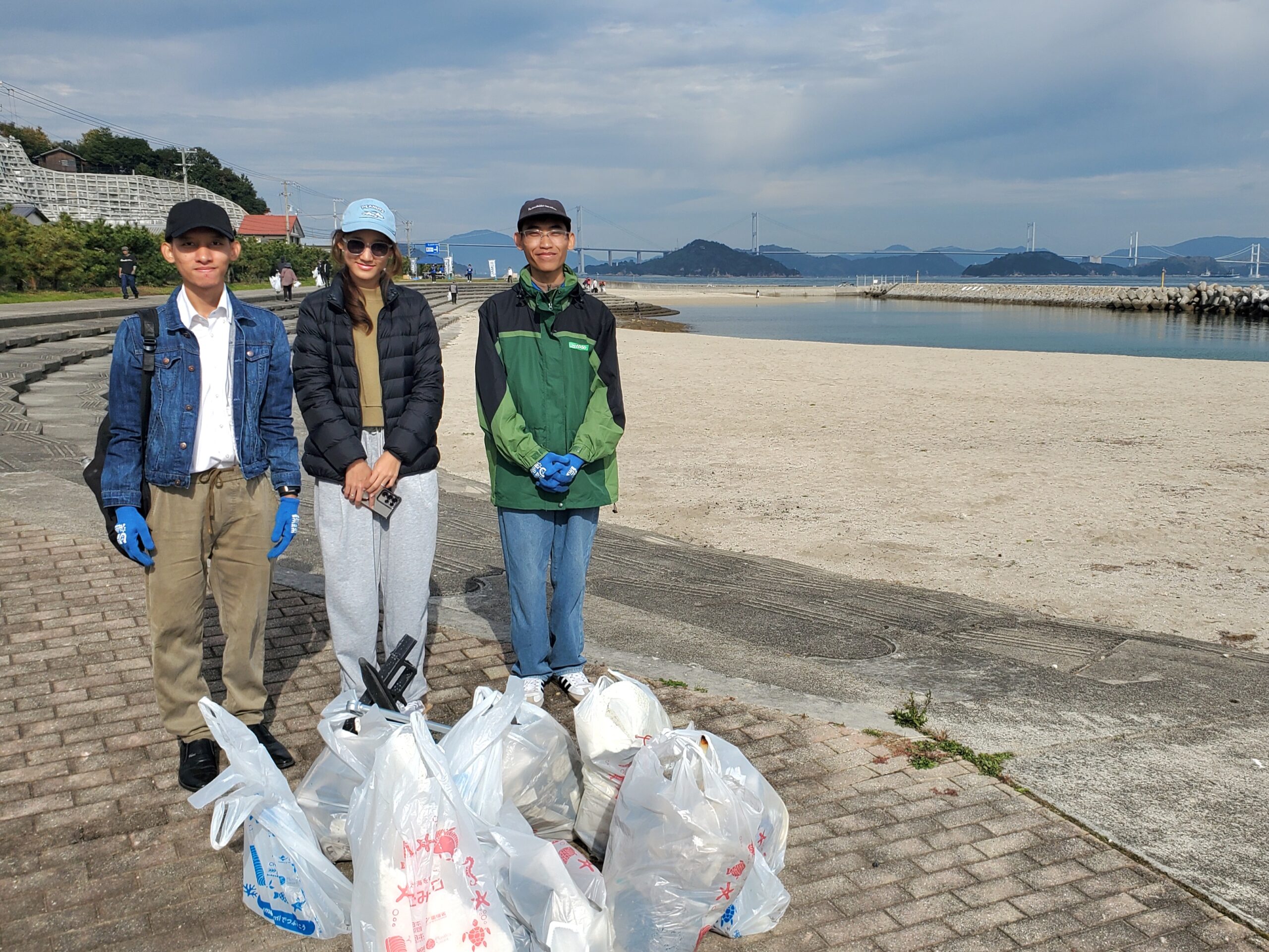 授業当日、学生30名ほどを海岸へ案内したところ、宝探しでもするかのようにゴミ袋を携え散っていった。同所は来島海峡に臨む絶景スポットでもあった。その時は、漂着した木くずを多く拾い集めたように思う。筆者としては手抜き授業のはずだったが、後で感想を訊くとちょっと意外な反応が返ってきた。参加したミャンマー・中国・ベトナム人留学生たちは、清掃ボランティアそのものをやったことがなく、〝貴重な体験ができた!〟と喜び、教育効果は大であった。そこで、昨年とは違うメンバーで、今年の秋は唐子浜で漂着ゴミの清掃ボランティアを行った。秋に入学したばかりのスリランカ・インドネシア留学生は、ゴミの分別に苦労している様子だったが、楽しそうな表情が印象に残った。