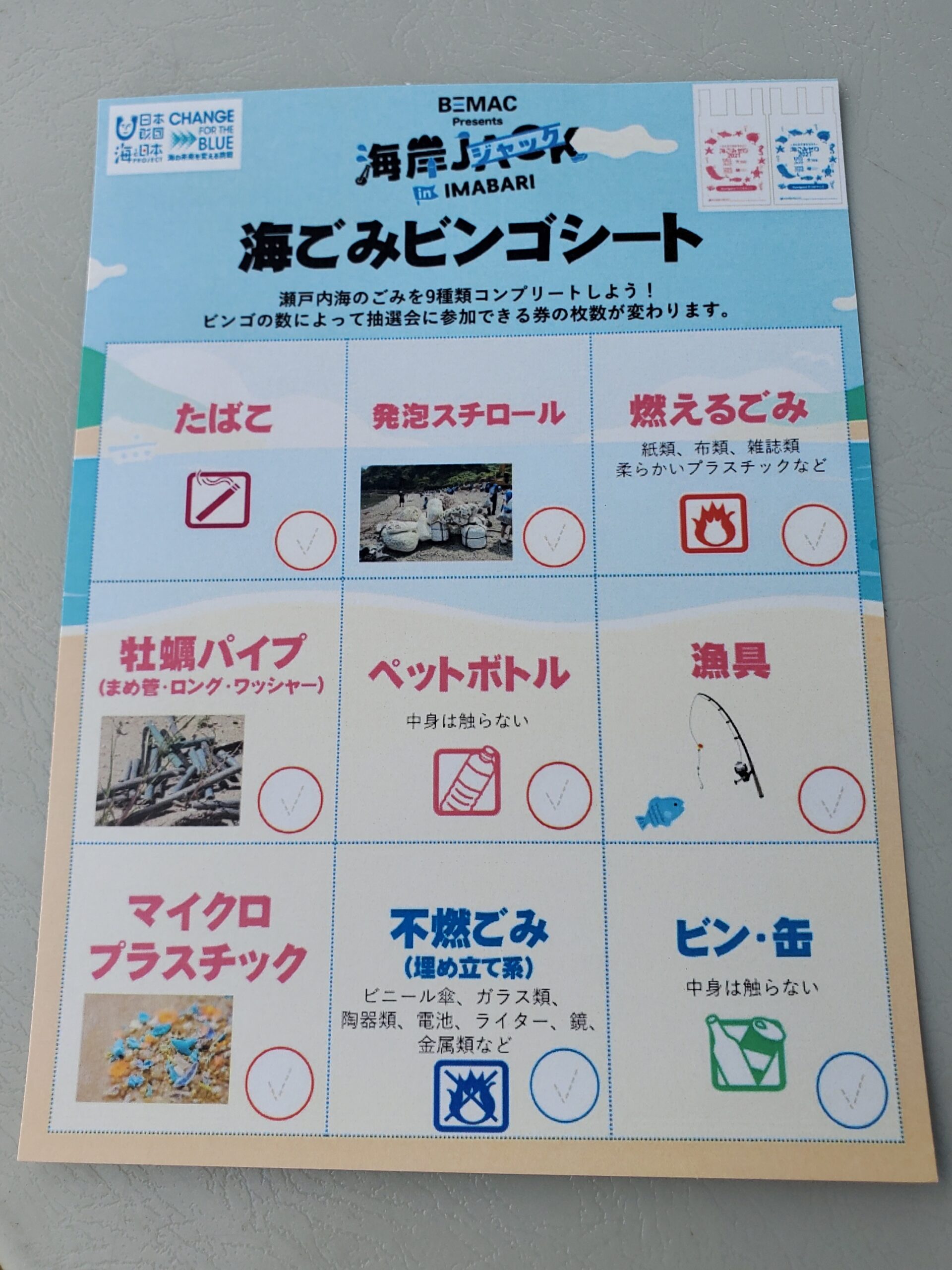 どういうゴミを拾ったかをチェックできるよう、参加者には「海ごみビンゴシート」が手渡され、9種類全部拾うと後で3枚の抽選券と引き換えできるシステムになっていた。