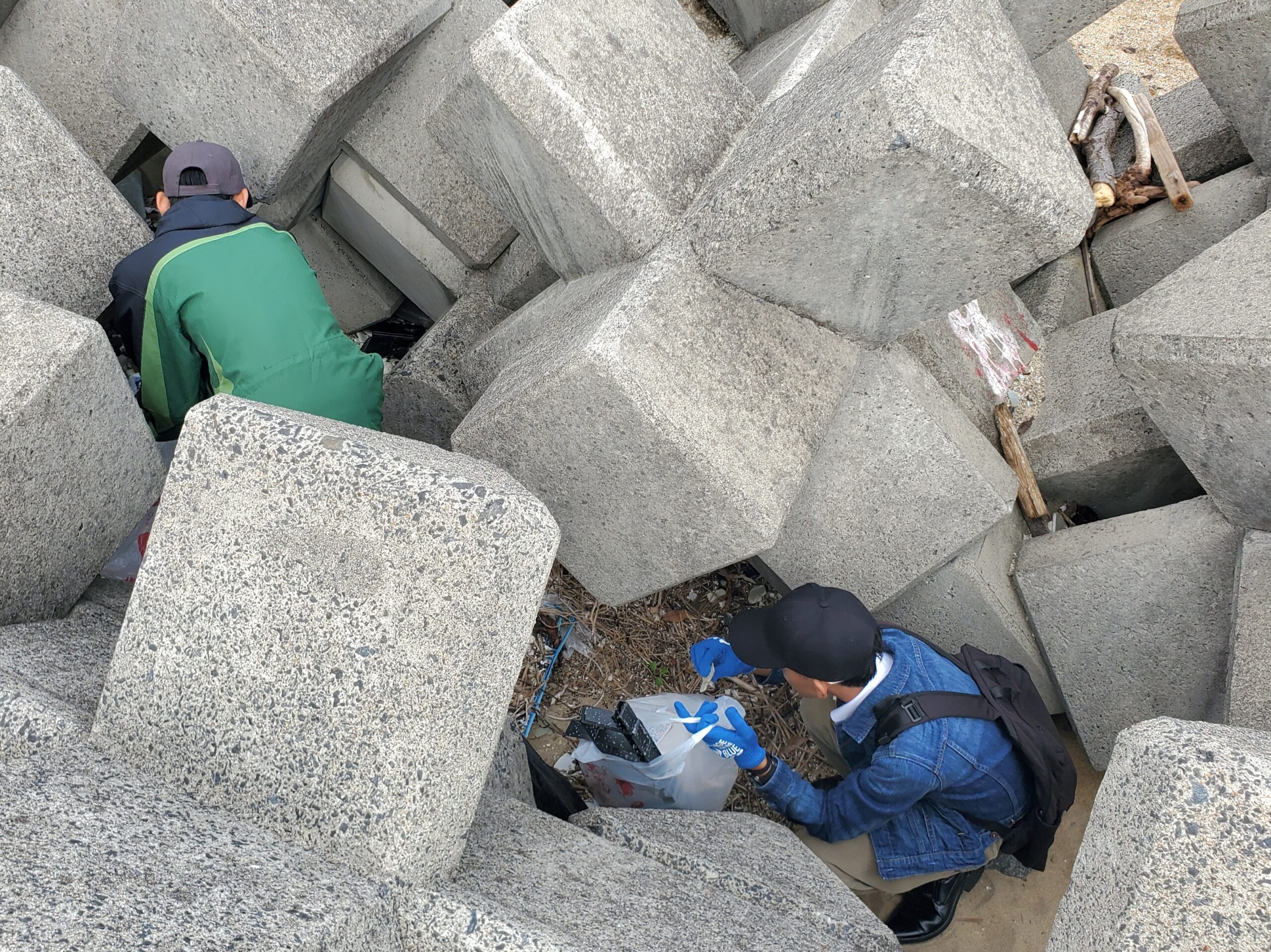 同所は4年くらい前から、「ビーチクリーンしまなみ」を中心に海岸清掃を定期的に実施しているが、それでも漂着ゴミが尽きないという。パッと見きれいに見えていた海岸にも、小さなマイクロプラスチックや牡蠣パイプ(まめ管・ロング・ワッシャー)を多く見つけることができた。定番のペットボトルやビン・缶、発泡スチロールは、テトラポット(消波ブロック)の中に隠れていた。太い舶用ロープやタイヤは、砂に埋もれて人力では取り出せないものもあった。最終的に、同所では1時間ほどの作業で61.7㎏のゴミを拾い集めることができた(織田が浜は、40名で23.9㎏)。