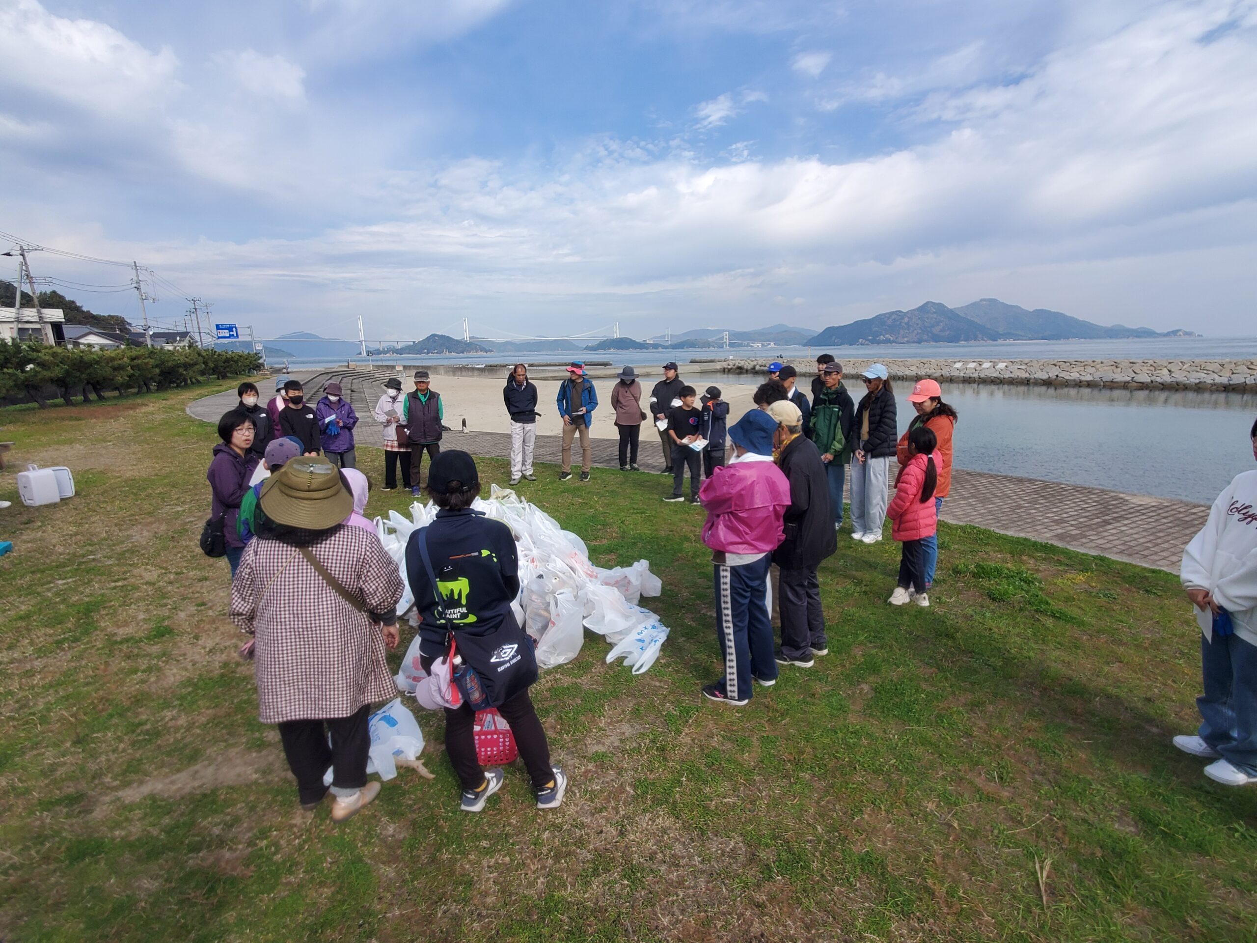 当日は、市内3会場(①鴨池海岸 ②湊・大新田海岸 ③織田ヶ浜)同時で午前中に海岸清掃が実施され、筆者と留学生3名は②湊・大新田海岸を選んだ。同所の参加者は32名いたが、市内小学生や今治北高校生、愛媛大学生など若い世代もいて、楽しみながらゴミを集める姿が印象的だった。