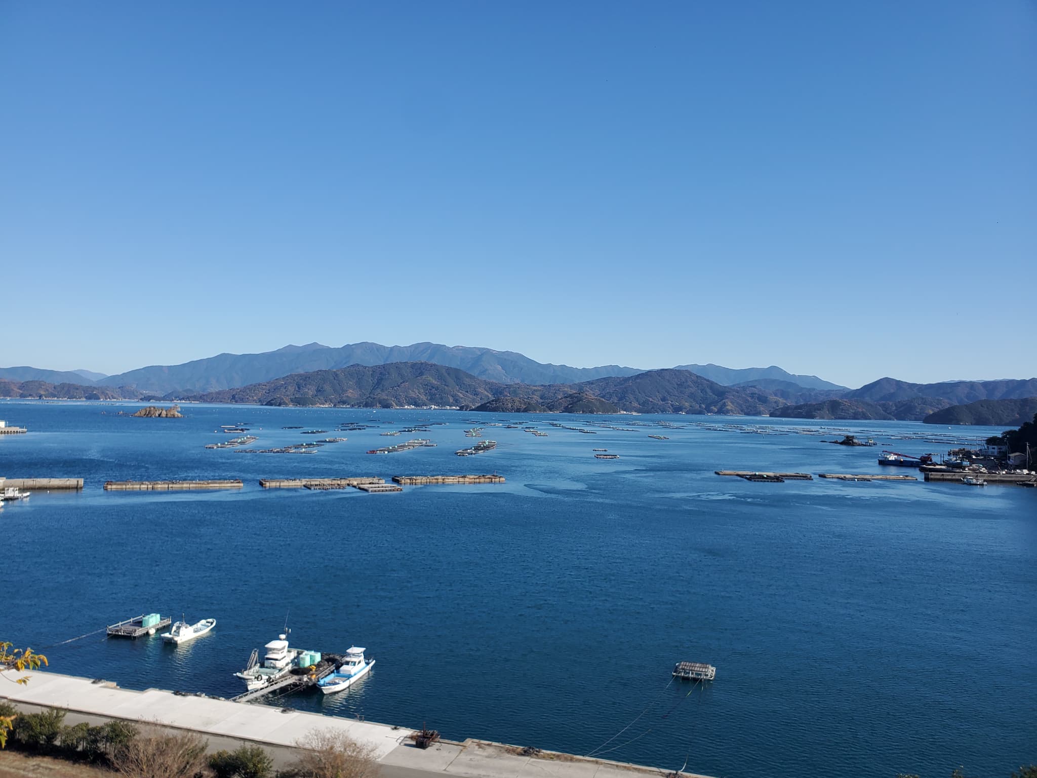 筆者は数年前、家族をともなって約20年ぶりに遊子水荷浦を訪ねました。週末ということで、すっかり観光客でにぎわっていました。昨年12月22日は平日の月曜日。冬至の割にはポカポカ陽気の午後でしたが、訪ねた午後2時頃にいた観光客は1組の老夫婦だけでした。とにかく静かで、トビの鳴き声と沖の養殖筏から帰ってくる漁船のエンジン音だけが耳に入ってきました。畝にかぶせた黒いブルーシートは、春ジャガイモを植えた場所のようで、実際に一人の住民男性がその作業を行っているところでした。やはり人力での作業は今でも大変で、現在はモノラックや軽トラを使える場所もあるようでした。尾根筋まで登ると、前面に広がる湾に整然と養殖筏が浮かんでいました。どんな魚介類を育てているのかは気になるところで、午前中に宇和島港住吉埠頭で見た活魚運搬船の積み荷のブリを想像しました。後で遊子漁協に問い合わせると、マダイとのことでした。私たちが口にする魚介類が、どこで育ち、どのようにして運ばれてくるのかは、もっと関心をもっていいことだと思います。南予のリアス海岸では、他にも真珠・マグロ・ハマチなどの養殖も有名ですが、耕して天に至る段々畑が広く見られた頃は、イワシ漁が盛んだったとも聞きます。