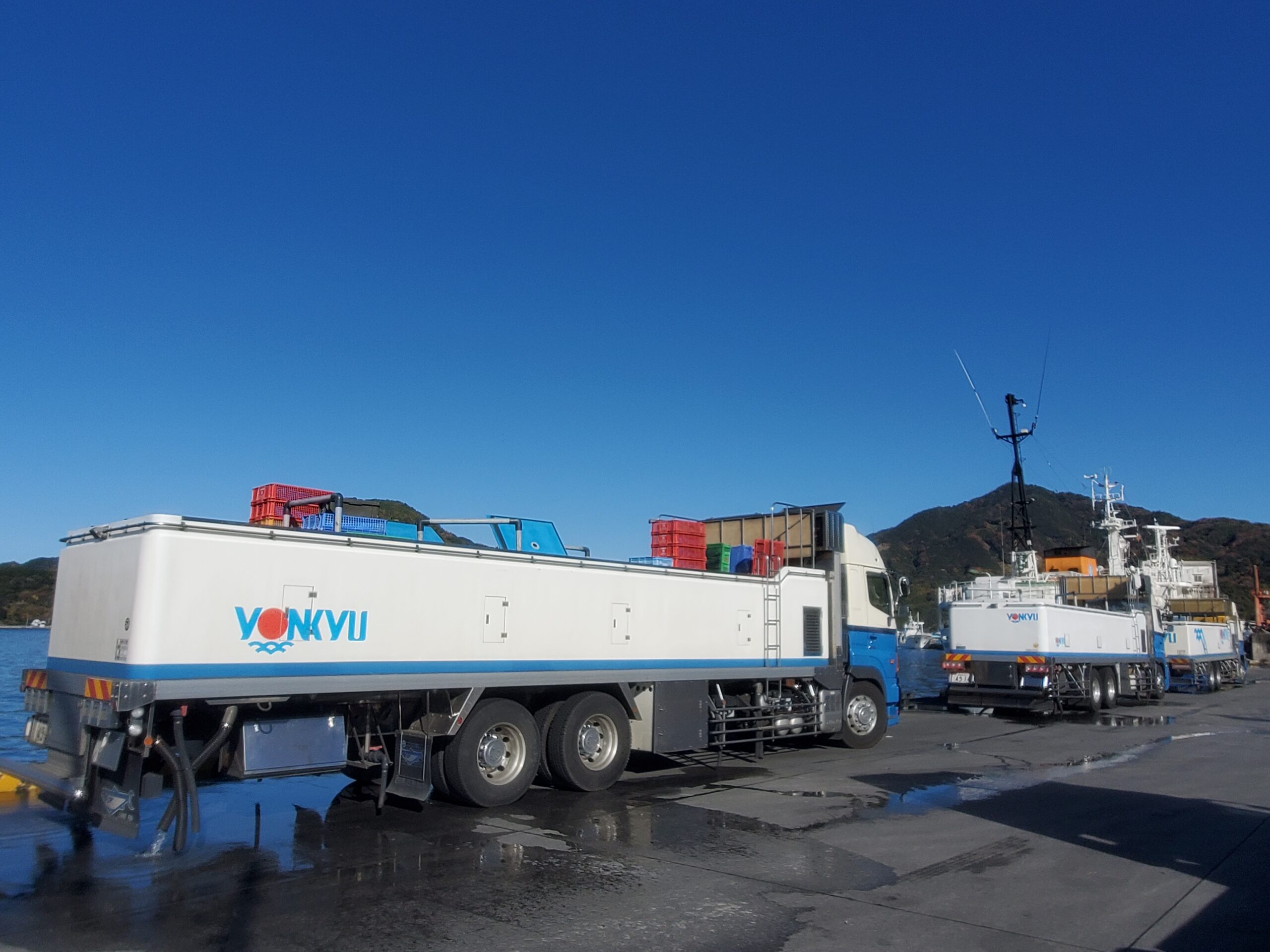 大抵、紀伊半島南岸から東海地方の沖合でよくすれ違い、同郷の船ということで親しみを感じたものです。タンカー船が魔法瓶のような槽内にオイルやガスを積載しようものなら、活魚運搬船では海鮮料理店の生け簀のような槽内で活きた魚が泳いでいるのです。一方、陸上に目を向ければ、松山自動車道(高速道路)や国道56号線では、トラックに水槽を載せた活魚運搬車をよく見かけます。筆者の中では、活魚運搬船と活魚運搬車を見れば、養殖業の盛んな宇和島や南宇和郡をイメージするのです。